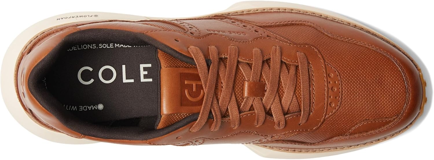 MODERN CRAFT. Precision engineering inside handcrafted details create the perfect balance of classic running with Cole Haan heritage. Always look as good as you feel. Fullgrain leather or premium suede vamp & quarter to deliver against a more elevated price point. Multimaterial overlays with craft details throughout. Soft and Premium materials for all day wear. Perf details on vamp and tongue to hint at our dress heritage in a fresh way. Leather welt and heel overlay with pinking shear detailing applies craft to this pattern like only Cole Haan can. RESPONSIVE AND RESPONSIBLE CUSHIONING. High performance plant based FLOWERFOAM EVA Midsole in a retro running inspired design delivers responsive cushioning for all day comfort. STEADY TRACTION. Full rubber outsole, with a runninginspired traction pattern provides exceptional traction in all conditions